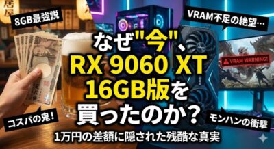 しかし、2026年現在。 話題の超大作**「モンスターハンターワイルズ」をはじめ、VRAM(ビデオメモリ)を湯水のように食いつぶすゲームが増えてきました。 「もしかして、俺が間違っていたのか…?」 そんな不安と好奇心に駆られ、ついに私はRX 9060 XT 16GB版**を自腹で購入してしまいました。