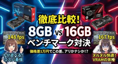 一方で、私の本来のスタンスである「8GB最強説」も捨てがたい。 今回の検証でも、モンハン以外のゲームでは8GB版が互角、あるいは勝利しています。 FPSゲーマーや、FF14プレイヤー、あるいは画質設定を「高」くらいに落として遊ぶ人にとって、16GB版は完全なオーバースペックです。