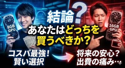 そう考えると、「今ある製品で、長く戦えるものを選ぶ」という視点は重要です。 今は8GBで足りていても、来年出る新作ゲームはモンハンのようにVRAM 12GB必須になるかもしれない。 その時に「ああ、あの時ケチらずに16GB買っとけばよかった…」と後悔するリスク。 この「将来への不安」を消すための保険料として、1万円は高いでしょうか?